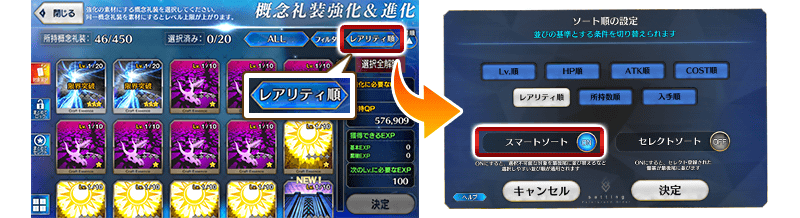 サーヴァントや概念礼装を強化する際は、強化素材選択画面で右上の「ソート順の設定」内にある「スマートソート」をONにしてみてください。
