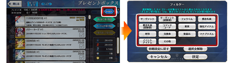 イベント報酬で大量に獲得したプレゼントのなかから、特定のものだけを受け取りたいときはフィルター機能が便利!