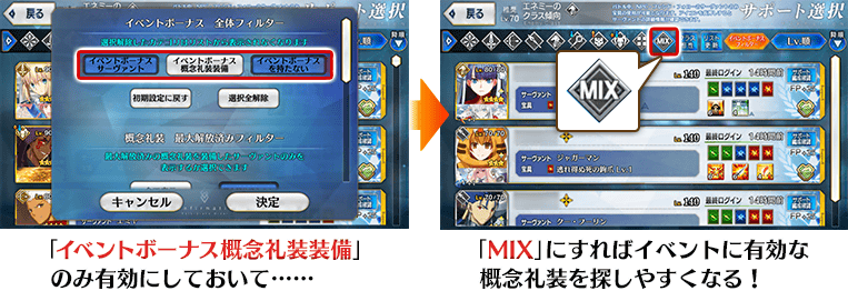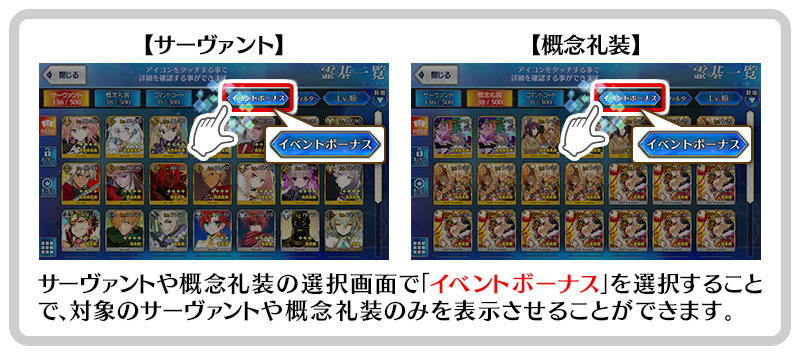 クエストのサポート選択で「イベントボーナス概念礼装を装備したサーヴァントだけを表示したい」という時は、サポート選択画面のイベントボーナス全体フィルターで設定可能です。