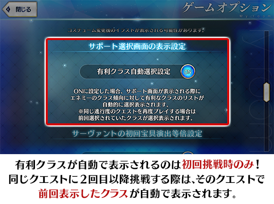 「有利クラス自動選択設定」がONになっている場合は、初めて挑戦するクエストのサポート選択画面で、対象クエストに有利なクラスが自動選択されます。