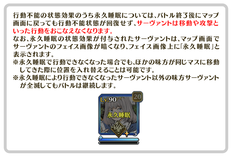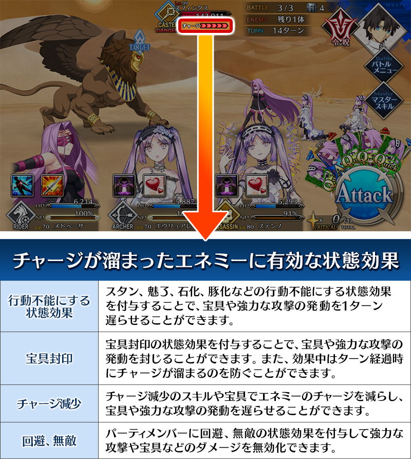 これらの攻撃には「スタン」「魅了」などの対象を行動不能にする状態効果、および「宝具封印」の状態効果などが有効です。