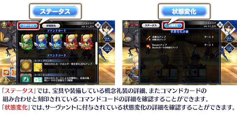 宝具詳細や装備している概念礼装、コマンドカード、刻印されているコマンドコードなど対象サーヴァントの状態が一目で確認できます。