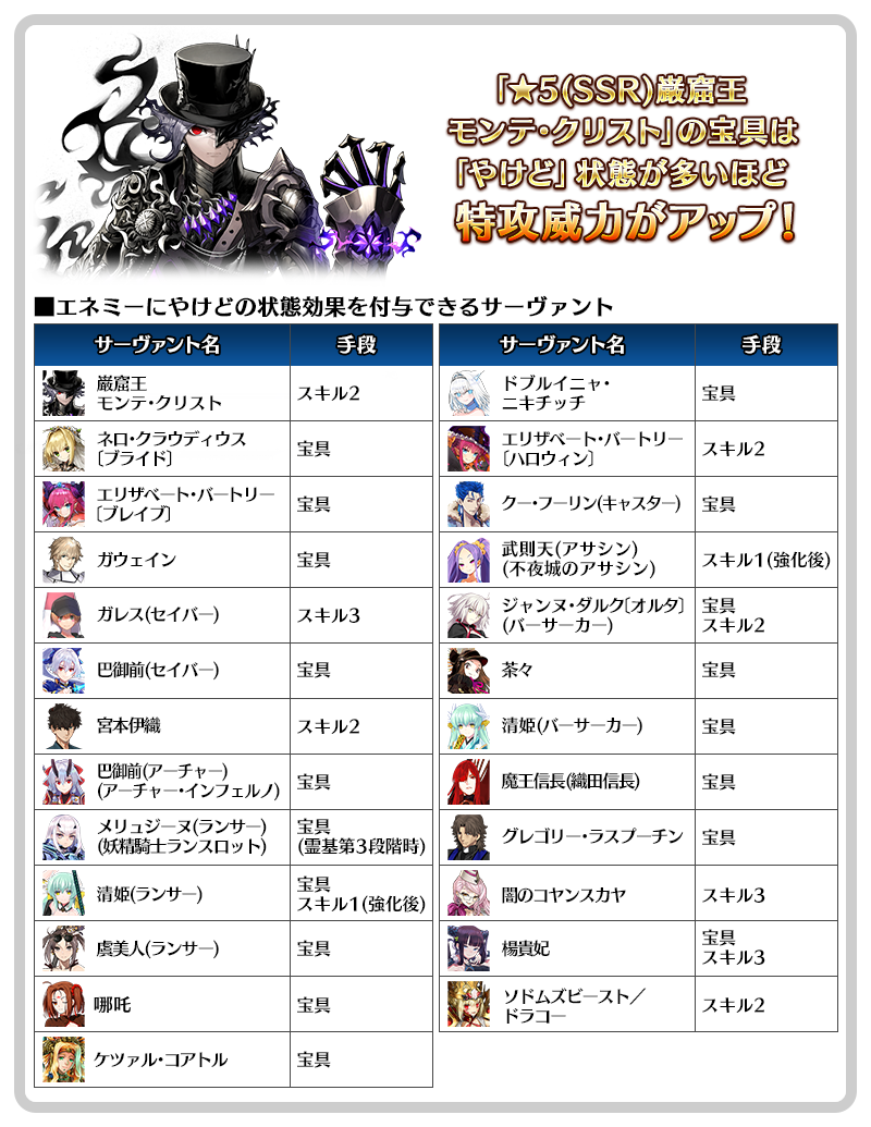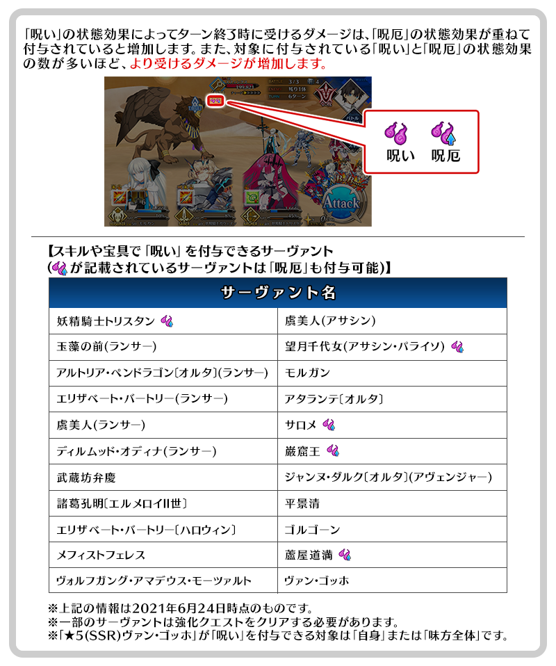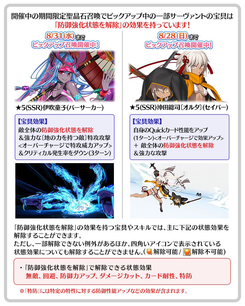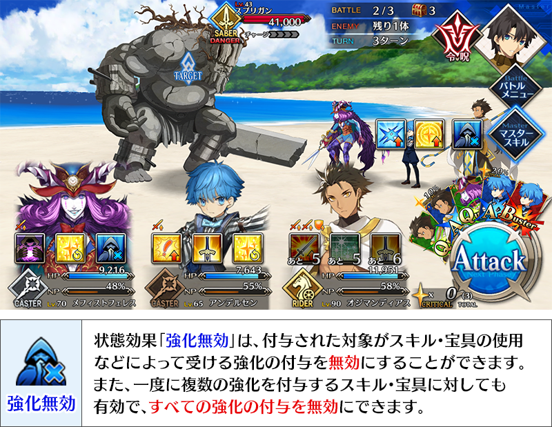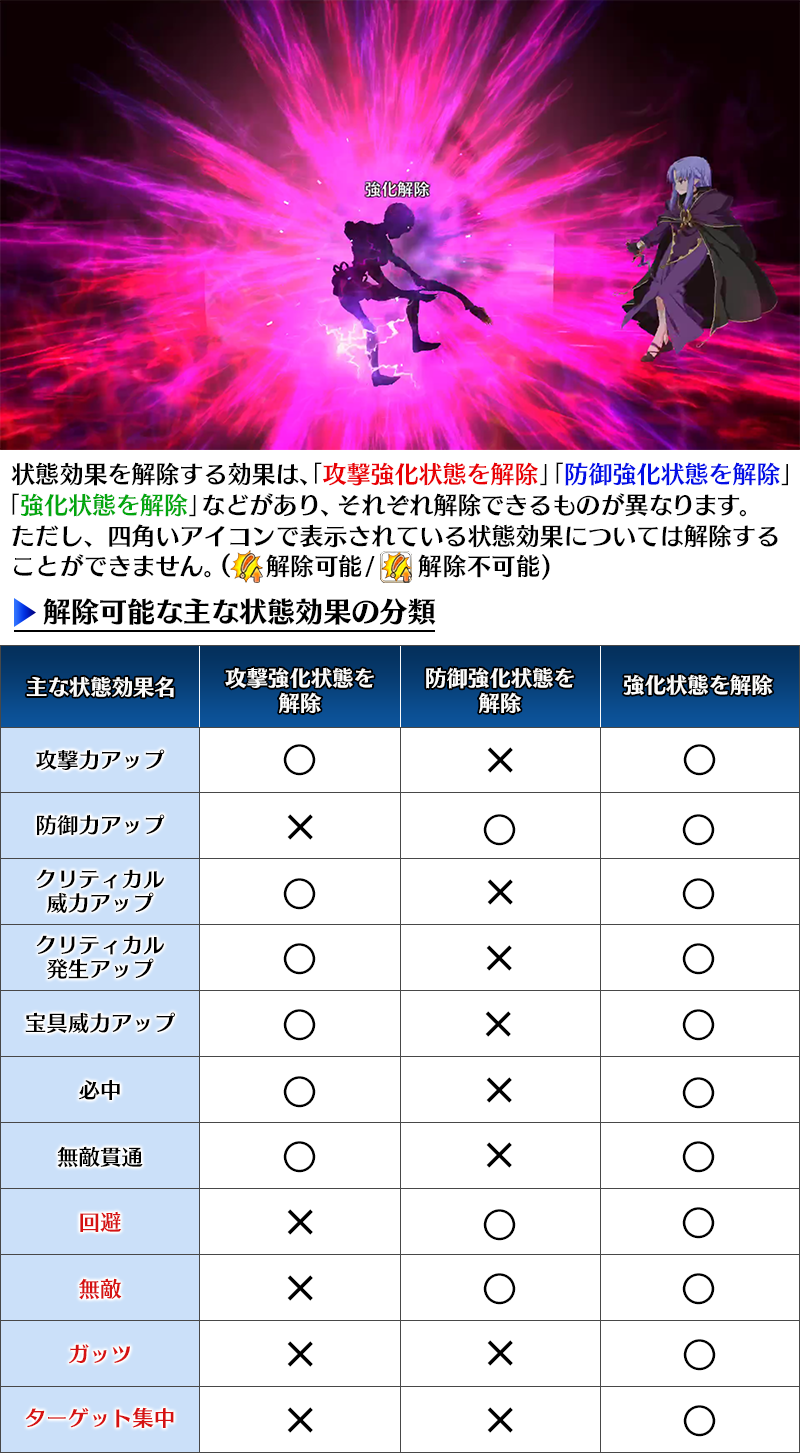 「攻撃力アップ」や「無敵」「回避」など、強力な状態効果を使用してくるエネミーには強化を解除する効果を持った宝具およびスキルを使えるサーヴァントが有効です。