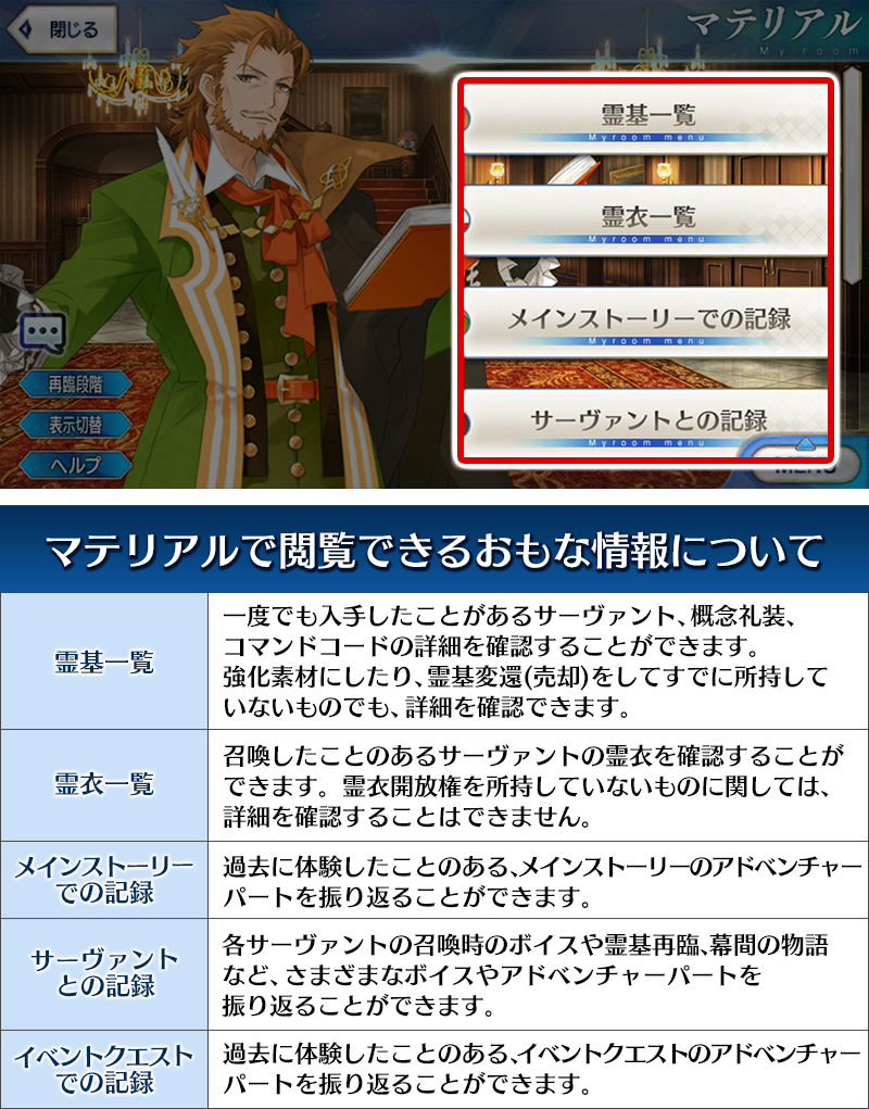 過去に体験したことのある「奏章Ⅳ」までのメインストーリー、メイン・インタールード、期間限定イベントのイベントCGやムービーは、マイルームの「マテリアル(ギャラリー)」から閲覧することができます。