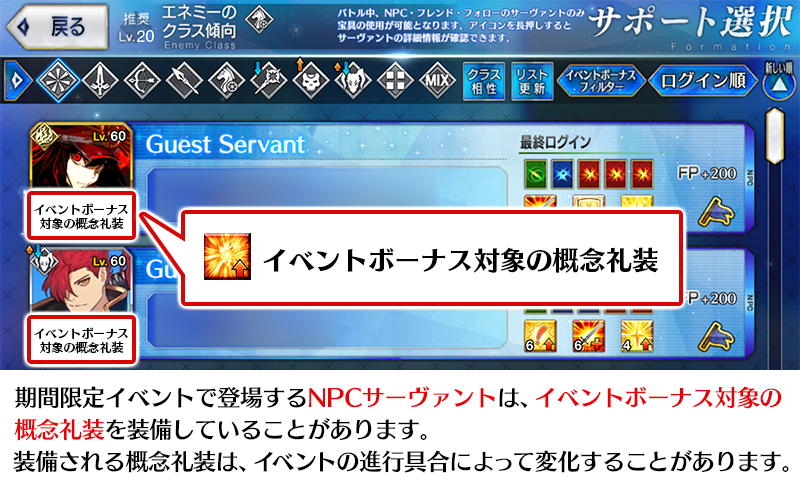 期間限定イベントで登場するNPCサーヴァントは、イベントボーナス対象の概念礼装を装備していることがあります。