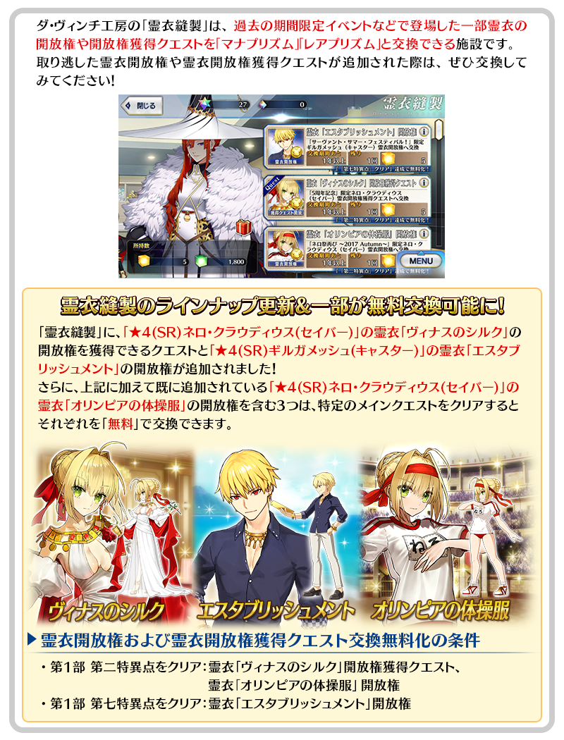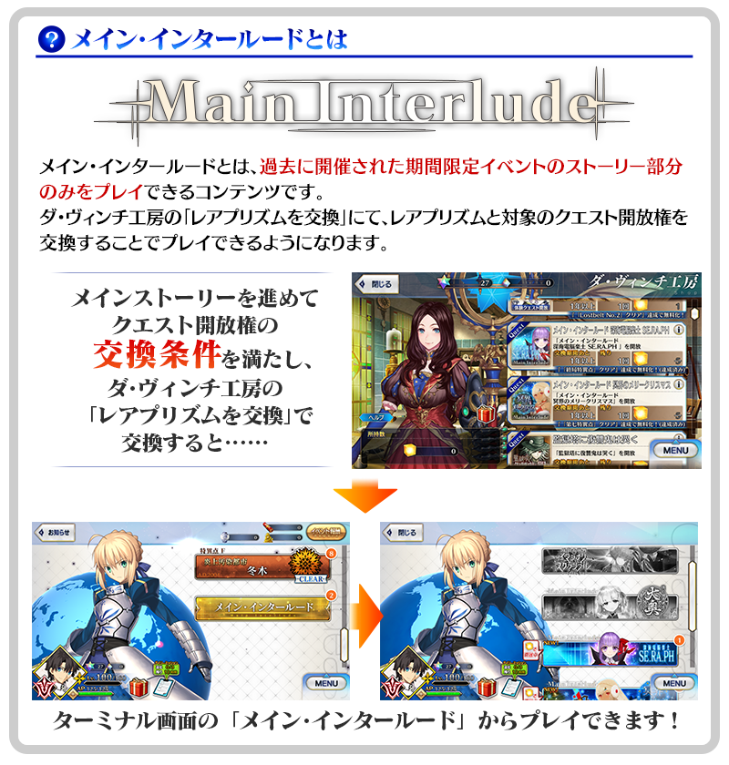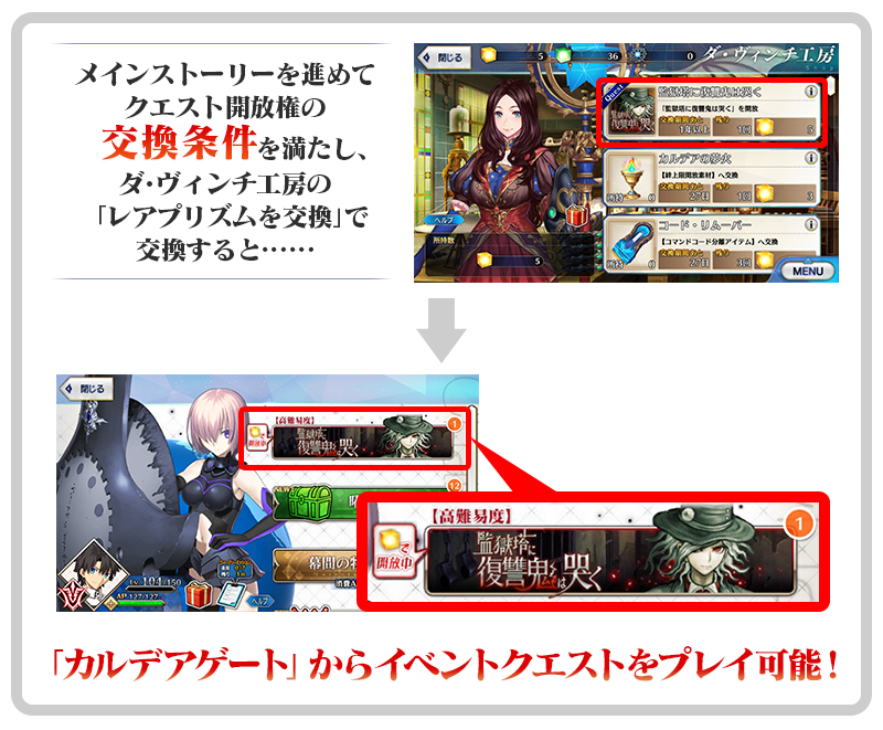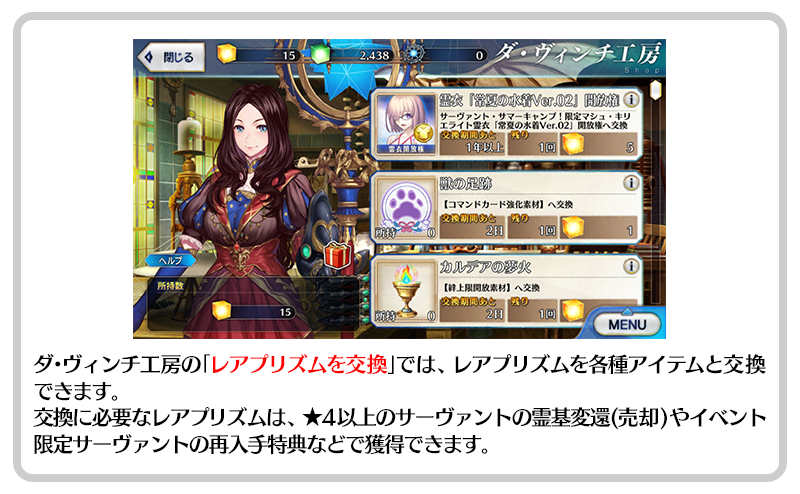 ダ・ヴィンチ工房の「レアプリズムを交換」では、過去に配信されたイベントクエストをレアプリズムを使って開放できます。