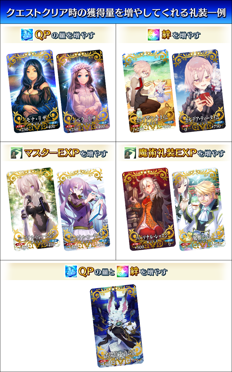 概念礼装の中には、クエストクリア時に手に入るQPや絆の獲得量を増やしてくれるものがあります。
