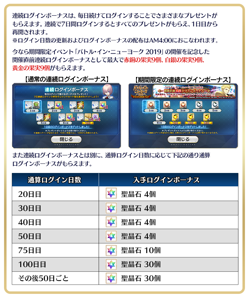 ログインボーナスには「連続ログイン日数」と「通算ログイン日数」でもらえるものがあります。