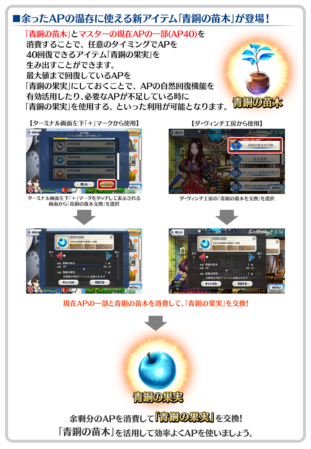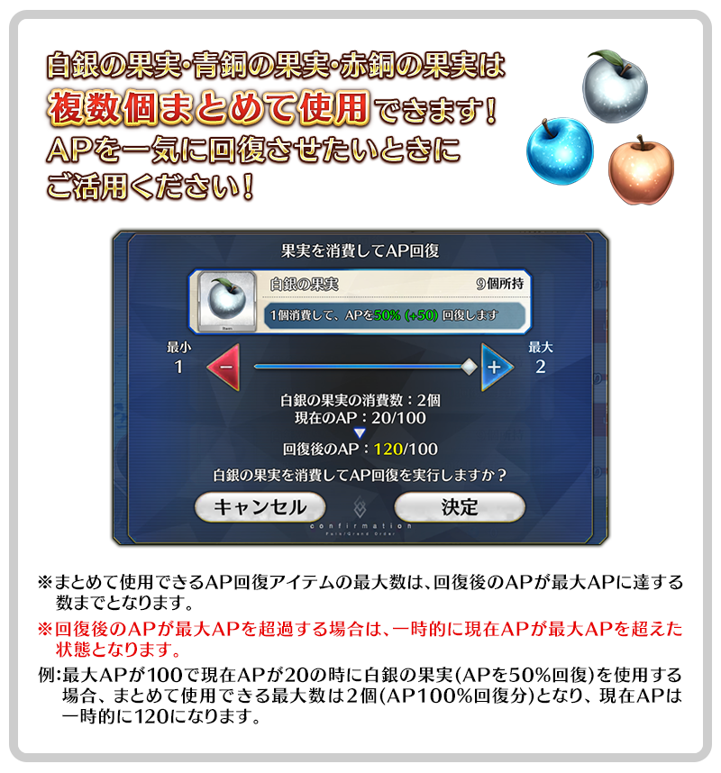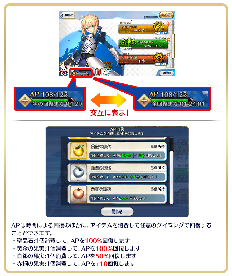 また時間による回復以外にも、聖晶石やAP回復アイテム(黄金の果実など)の消費で任意に回復することもできます。