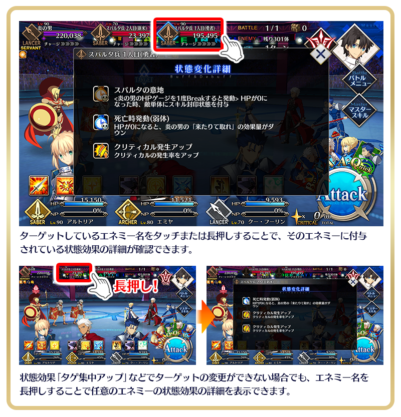 状態効果「タゲ集中アップ」などでターゲット変更ができない際も、エネミー名を長押しすることで状態効果の詳細を確認できます。