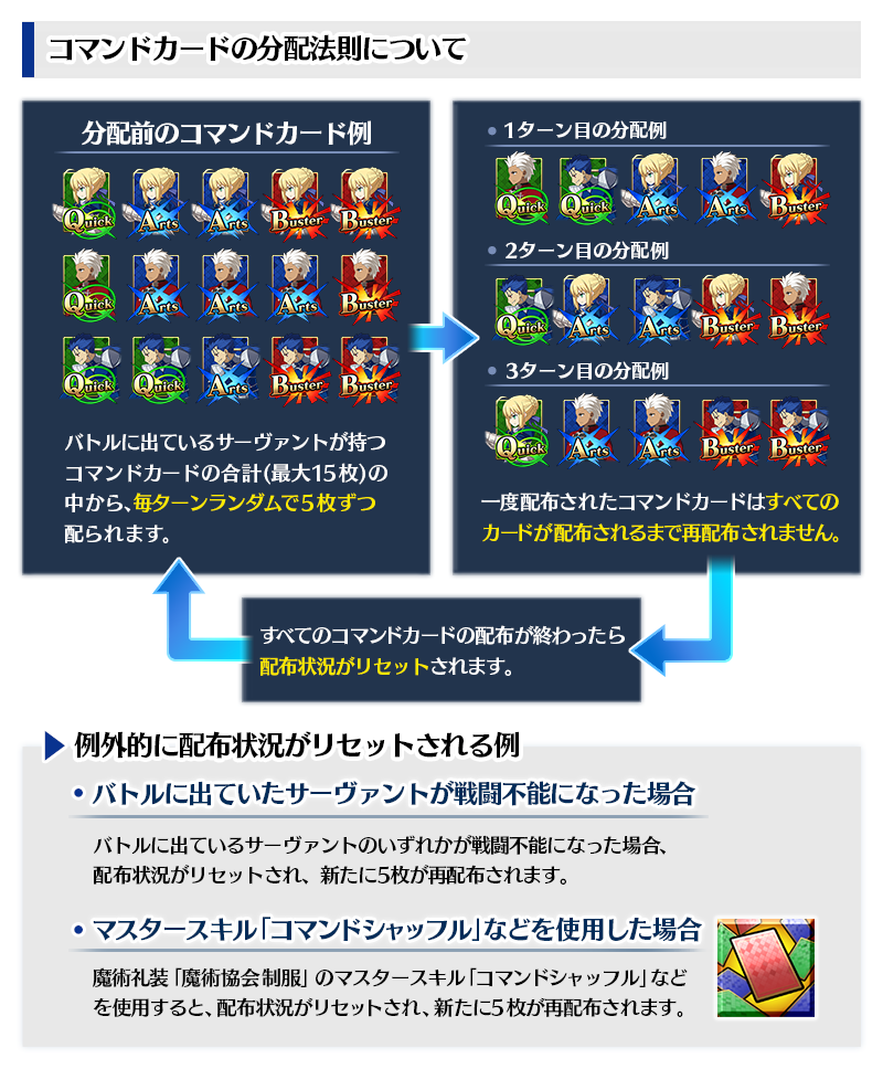 コマンドカードは、バトルに出ているサーヴァントが持つカードの合計(最大15枚)の中から、毎ターン5枚ずつ配布されます。