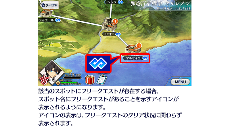 フリークエストが存在するスポット名の横にはアイコンが表示されます。