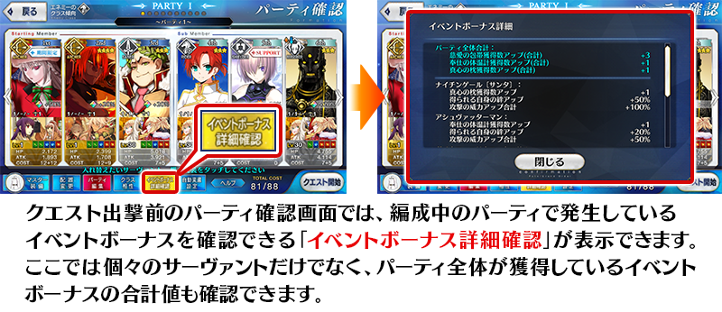 パーティ全体が獲得しているボーナスの合計値も分かるので、イベントクエスト用パーティを編成する際にご活用ください。