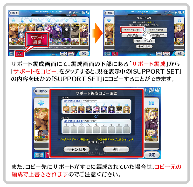 「サポート編成画面」では、現在表示中の編成をほかの「SUPPORT SET」にコピーすることができます。