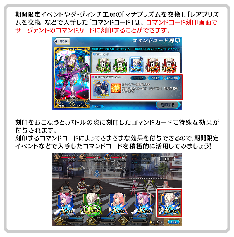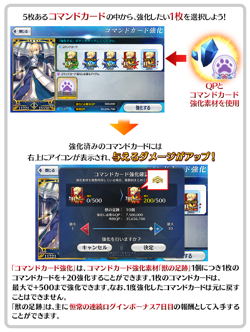 QPとコマンドカード強化素材「獣の足跡」を消費することで、コマンドカードの「攻撃力」を引き上げることができます。