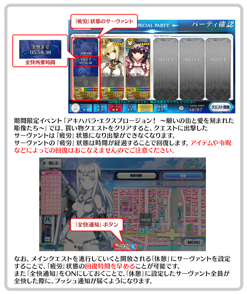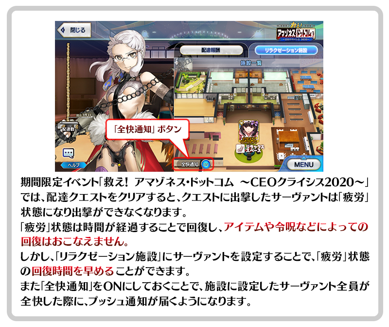 開催中の期間限定イベントでは、リラクゼーション施設を利用することでサーヴァントの疲労状態を短縮できます。