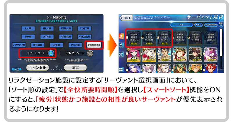 開催中の期間限定イベントではリラクゼーション施設との相性が考慮され、回復効率の高いサーヴァントが優先表示されます。