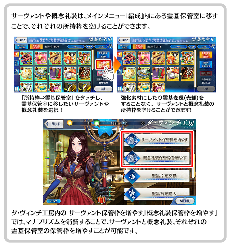 なお、ダ・ヴィンチ工房にてサーヴァント、概念礼装それぞれの保管枠を増やすことが可能です。