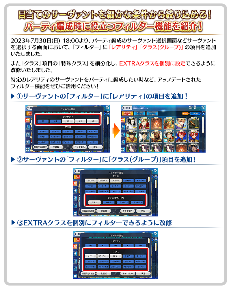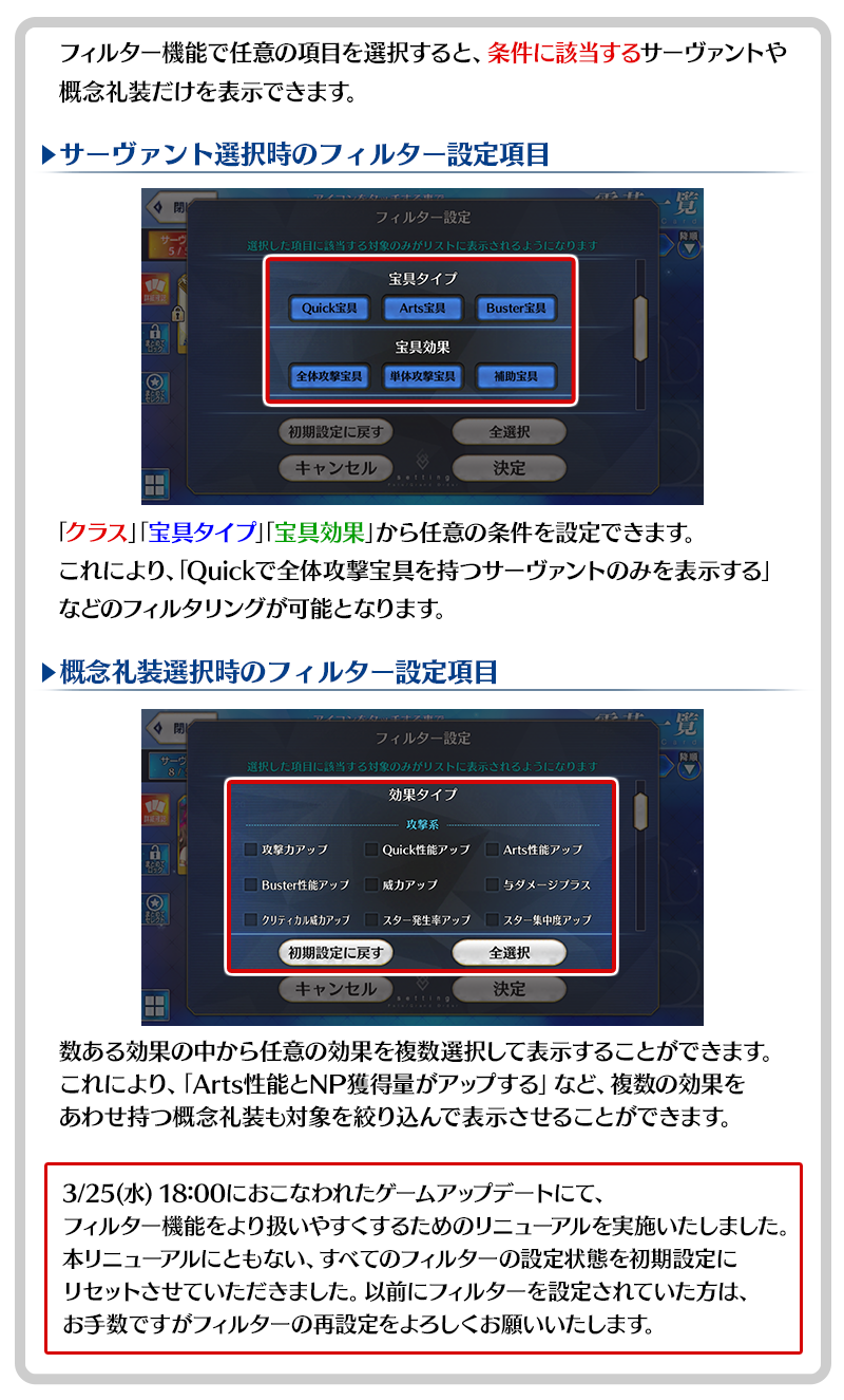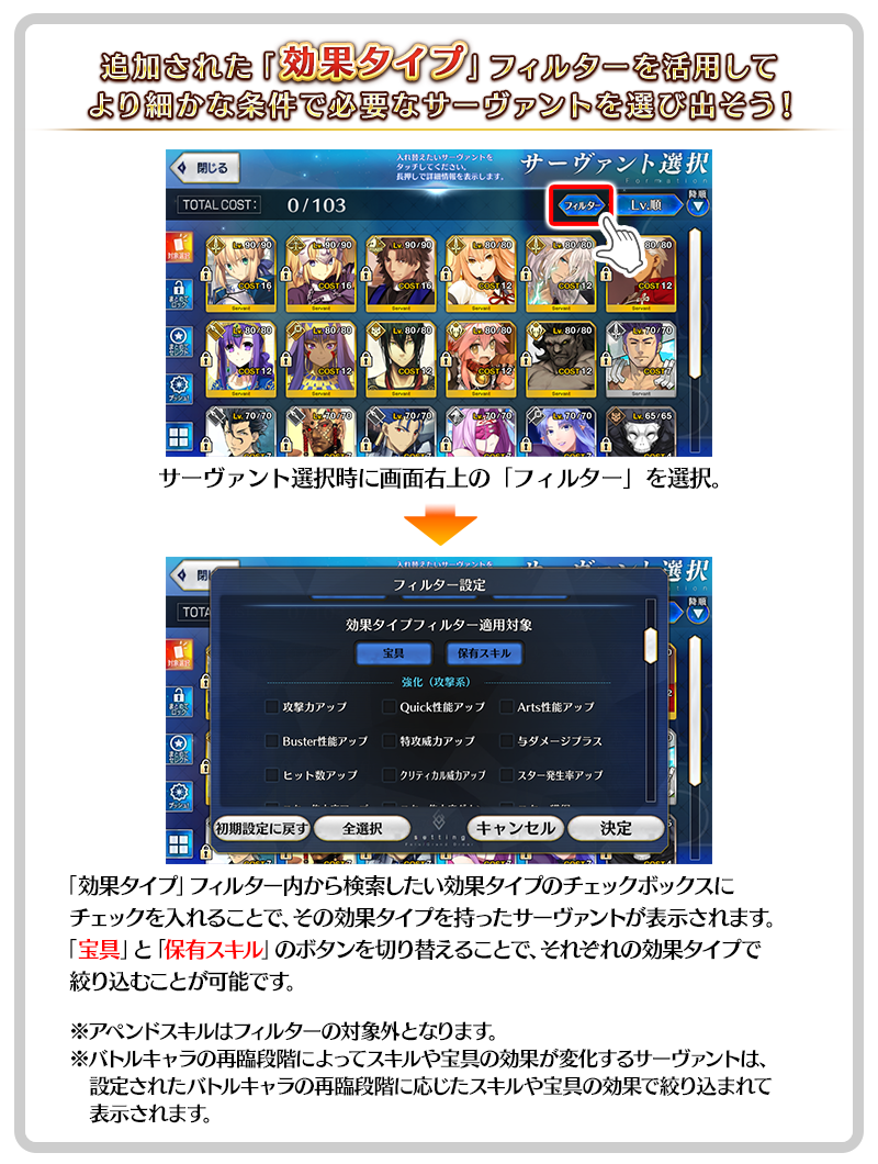 ※2025年7月2日(水)より、サーヴァント・概念礼装・コマンドコードの効果タイプのフィルター設定の項目や設定できる効果などに調整をおこないました。