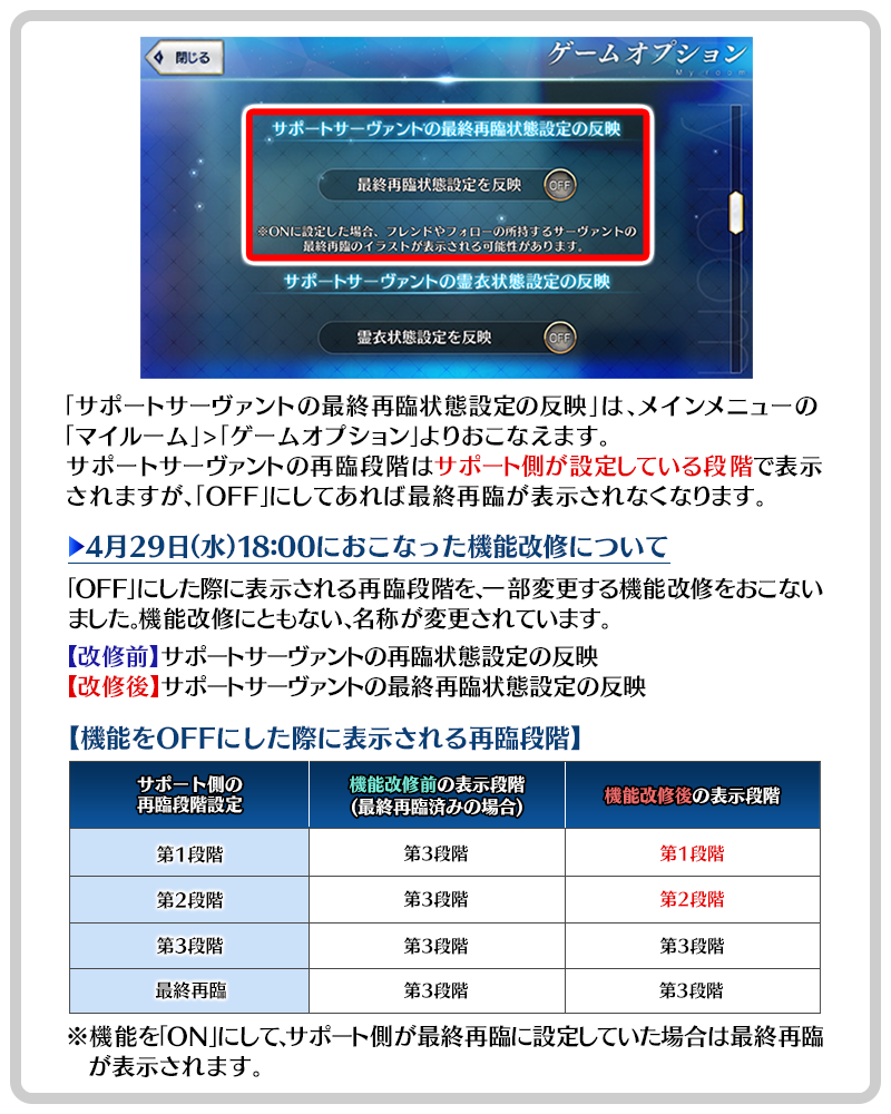 設定がOFFの時、従来は「最終再臨済みのサポート」は常に第3段階になりましたが、改修後はサポートが最終再臨段階に設定していた時のみ第3段階に置き換えられるようになります。