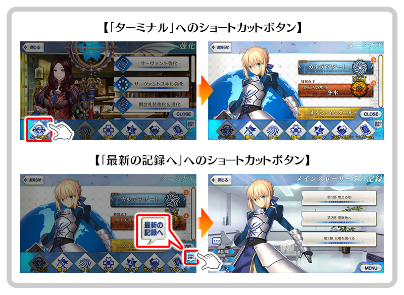 各画面からターミナル画面へ即座に移動できる「ターミナル」ボタンと、直接マテリアル内の最新ストーリーへ移動できる「最新の記録へ」ボタンが「MENU」に追加されました!