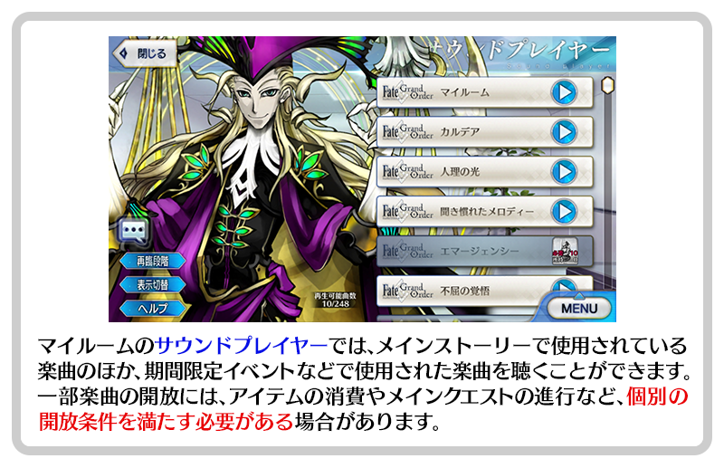 マイルームのサウンドプレイヤーでは、ゲーム内で使用されたさまざまな楽曲を聴くことができます。