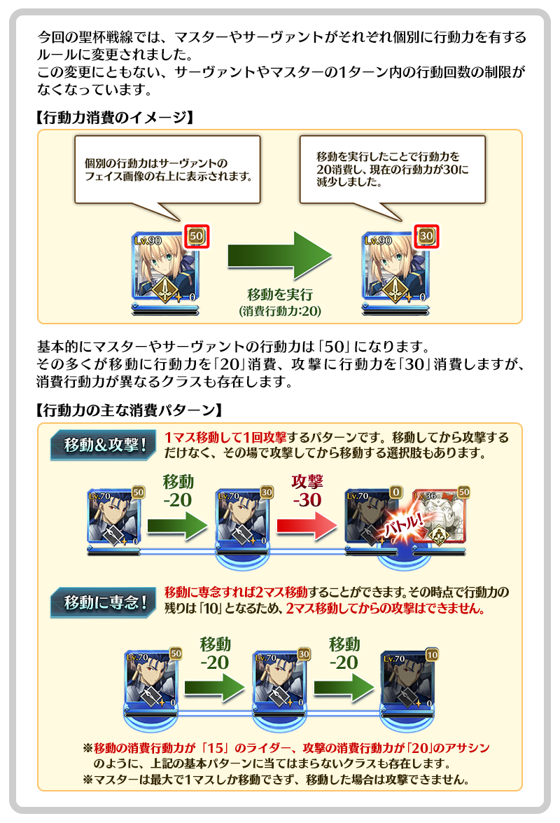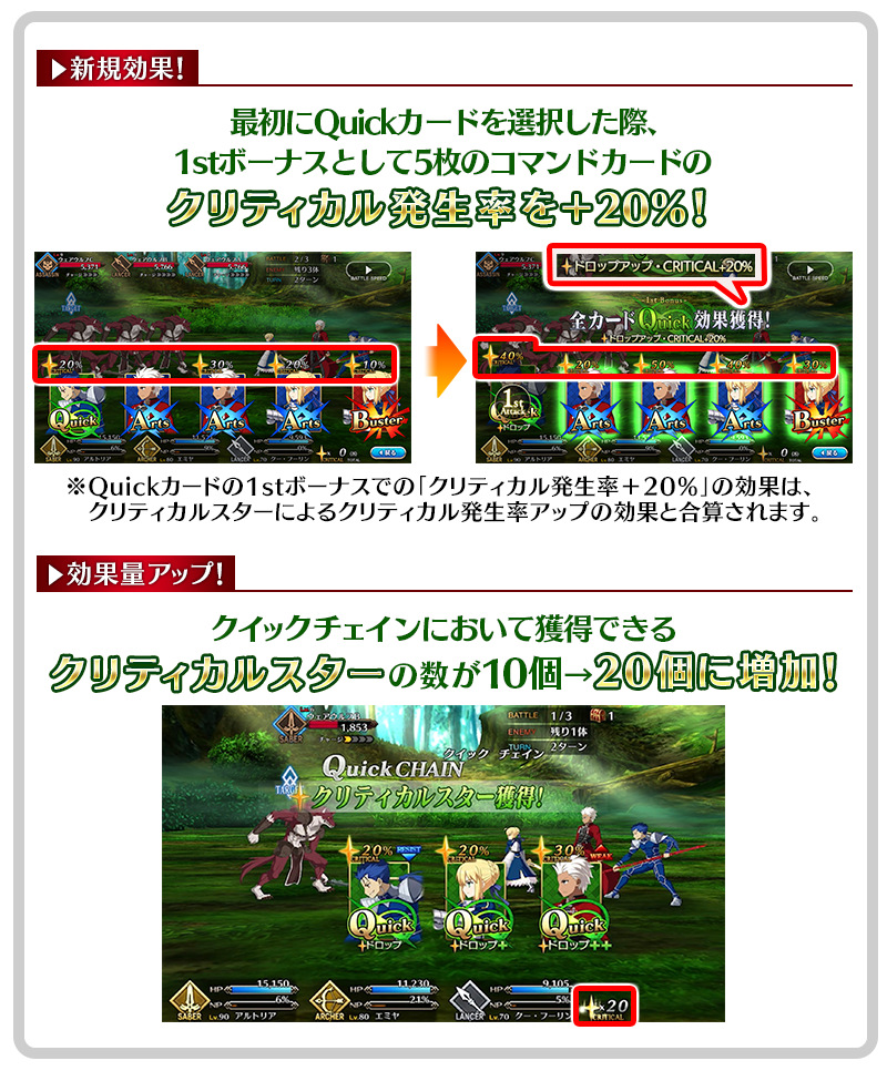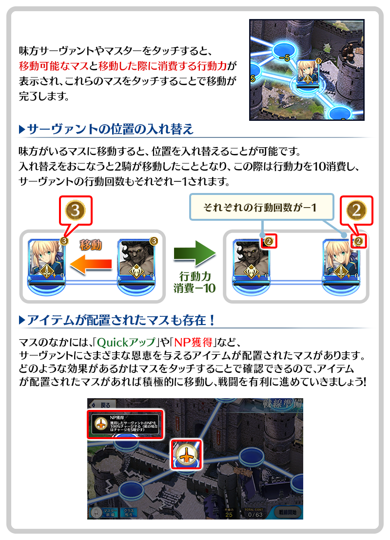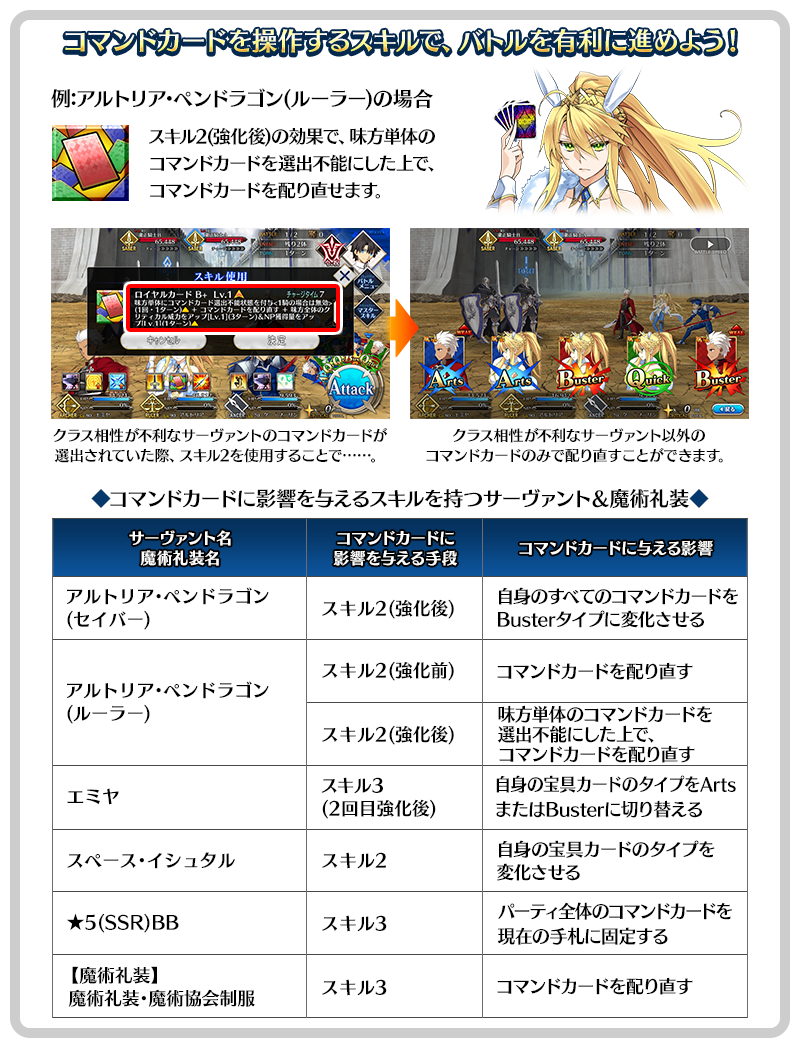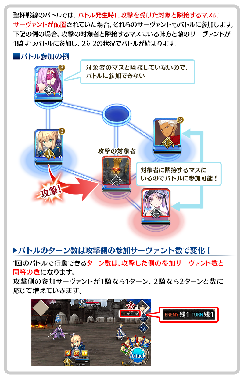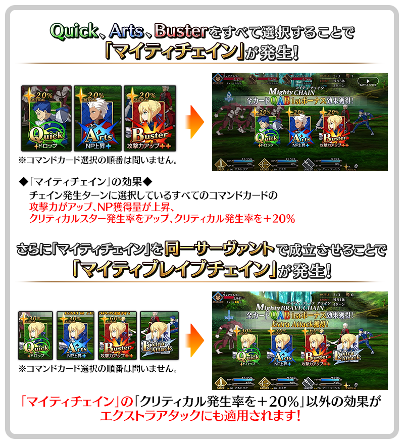 バトルでは3種のコマンドカード(Quick、Arts、Buster)の組み合わせによって「チェイン」が発生し、さまざまな効果を発動できます。
