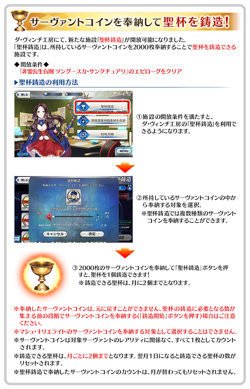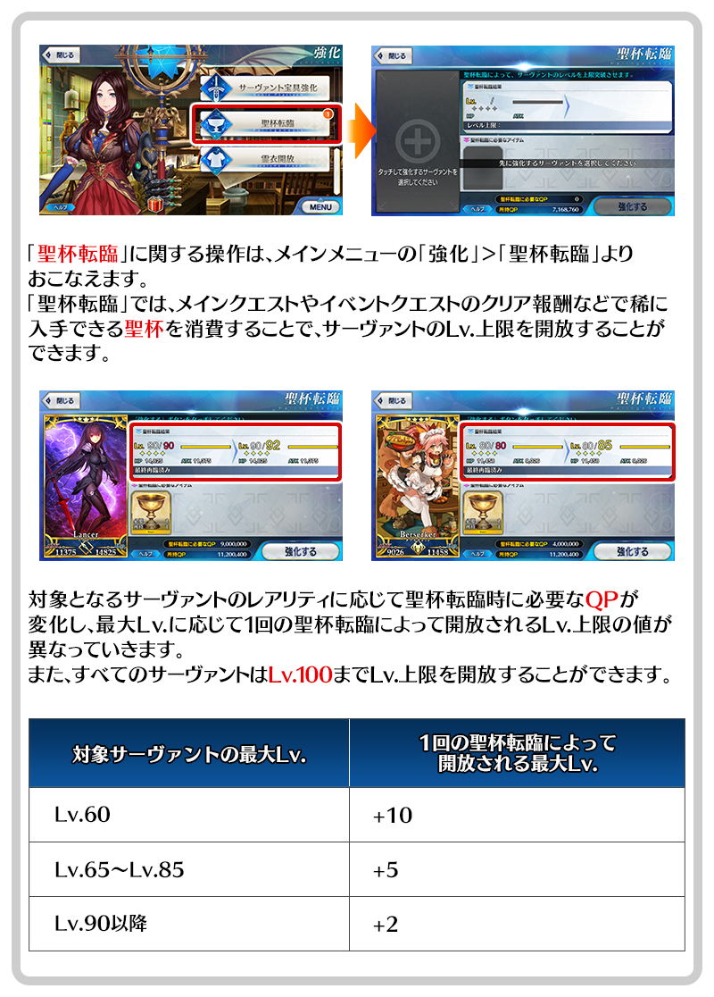 グランドサーヴァントを選定する条件の1つとして、「選定するサーヴァントのLv.100以上」があり、Lv.上限を解放するための聖杯のほか、サーヴァントを強化するためのEXPも必要となります。