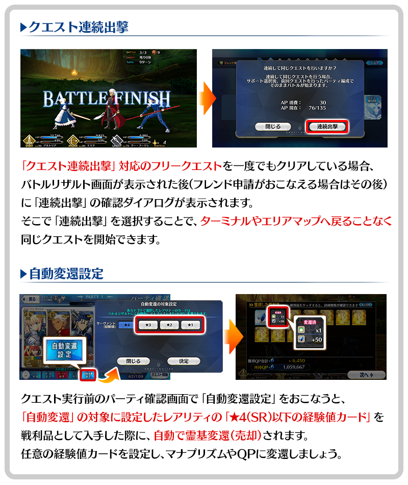 これにあわせてサーヴァントおよび概念礼装の強化時に、おすすめ素材選択で設定した素材が自動でセットされる機能も追加されました。