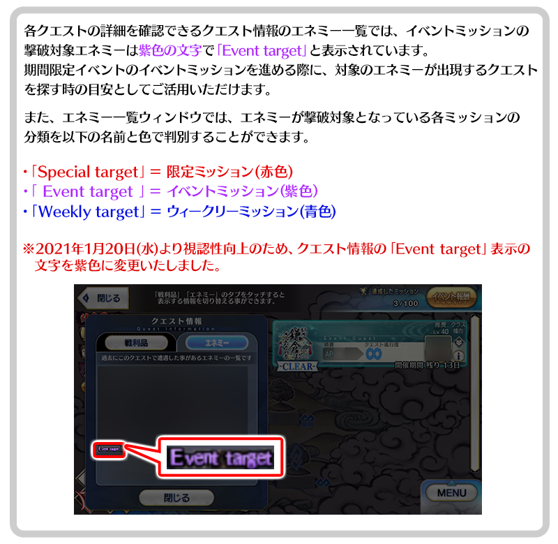 ◆イベントミッションにおける対象エネミーの確認方法について◆