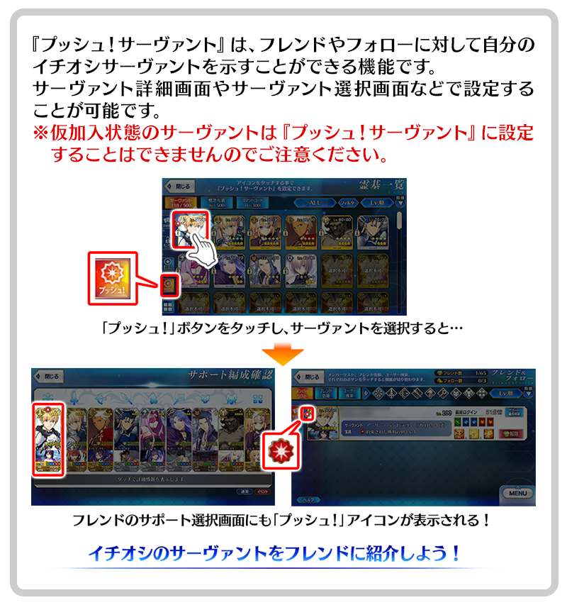 バトルでは、ほかのマスターのサーヴァントの力を借りることができます。強力なサーヴァントを所持したフレンドやフォローを増やしてクエストを進めましょう!