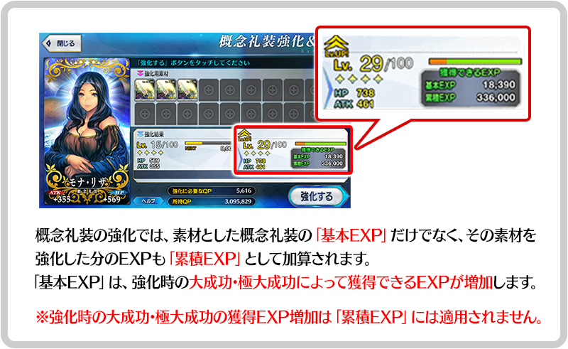 さらに、大成功・極大成功が発生しレベル上限到達時に獲得経験値が超過した場合、超過分の強化素材とQPが消費されないようになりました。