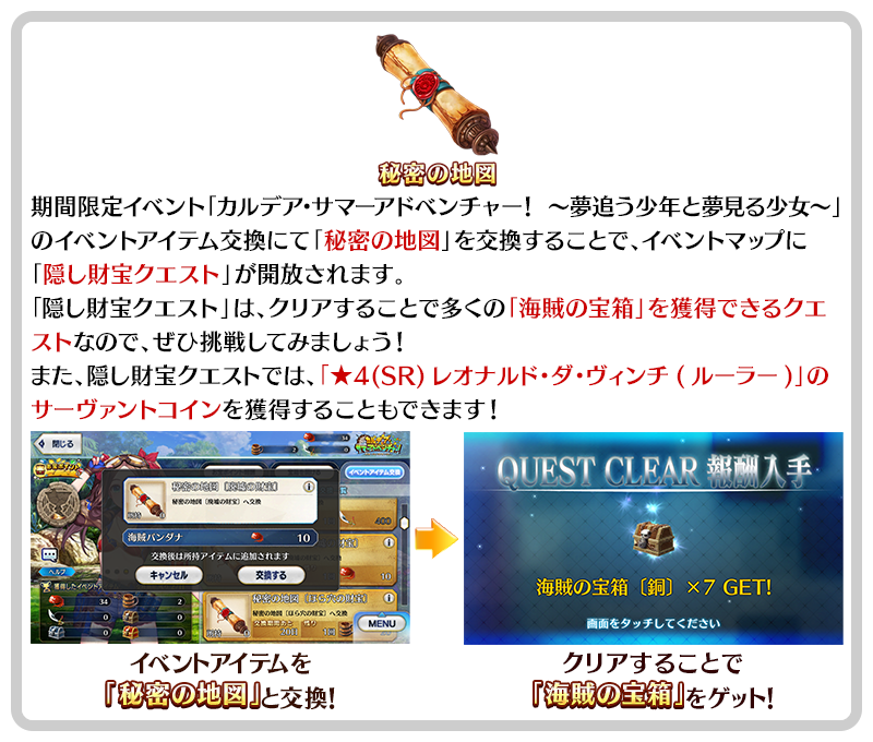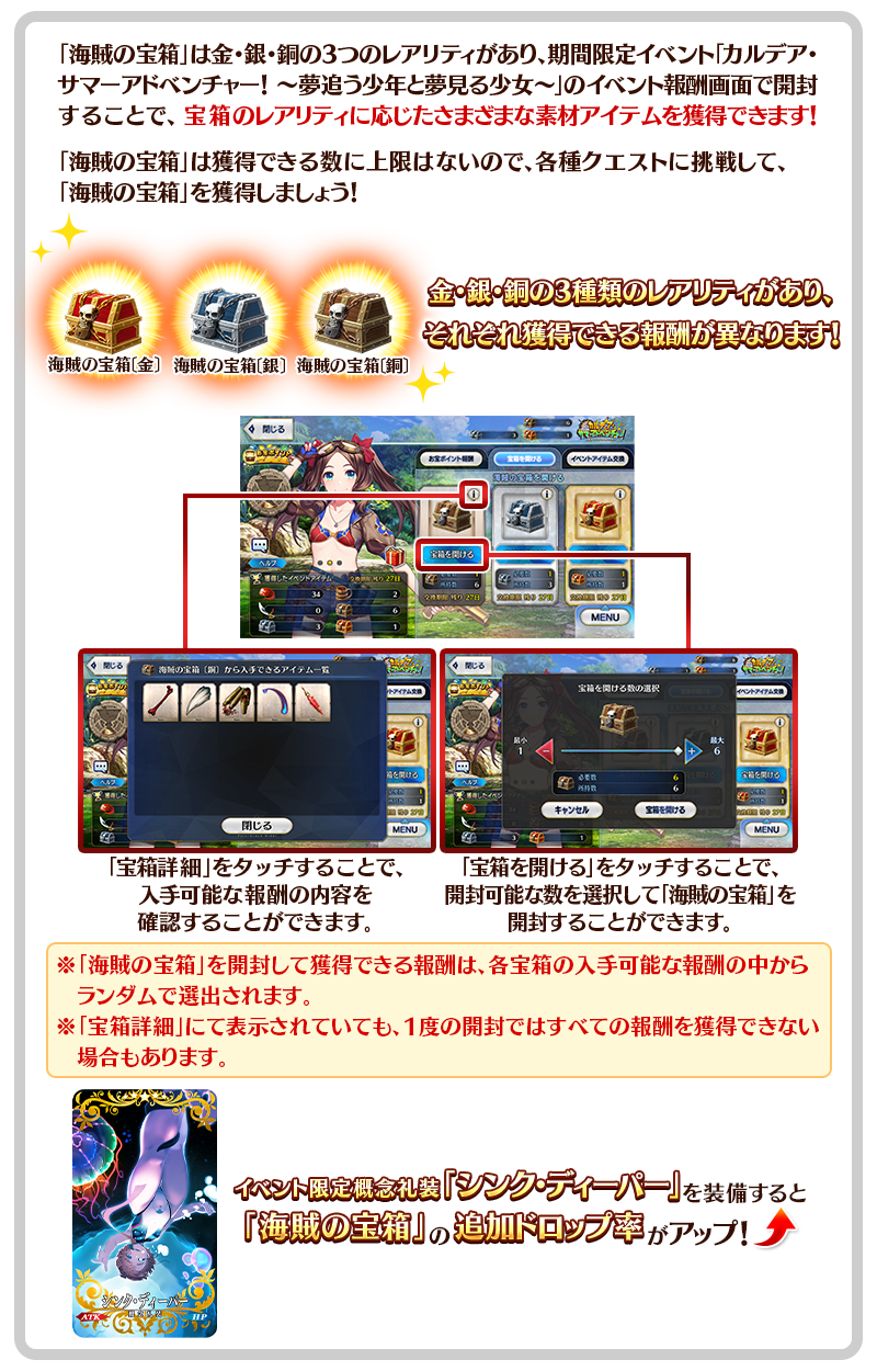 開催中の期間限定イベントでは、フリークエストに出現するエネミーを倒すと「夏の夢の宝箱」をドロップすることがあります。