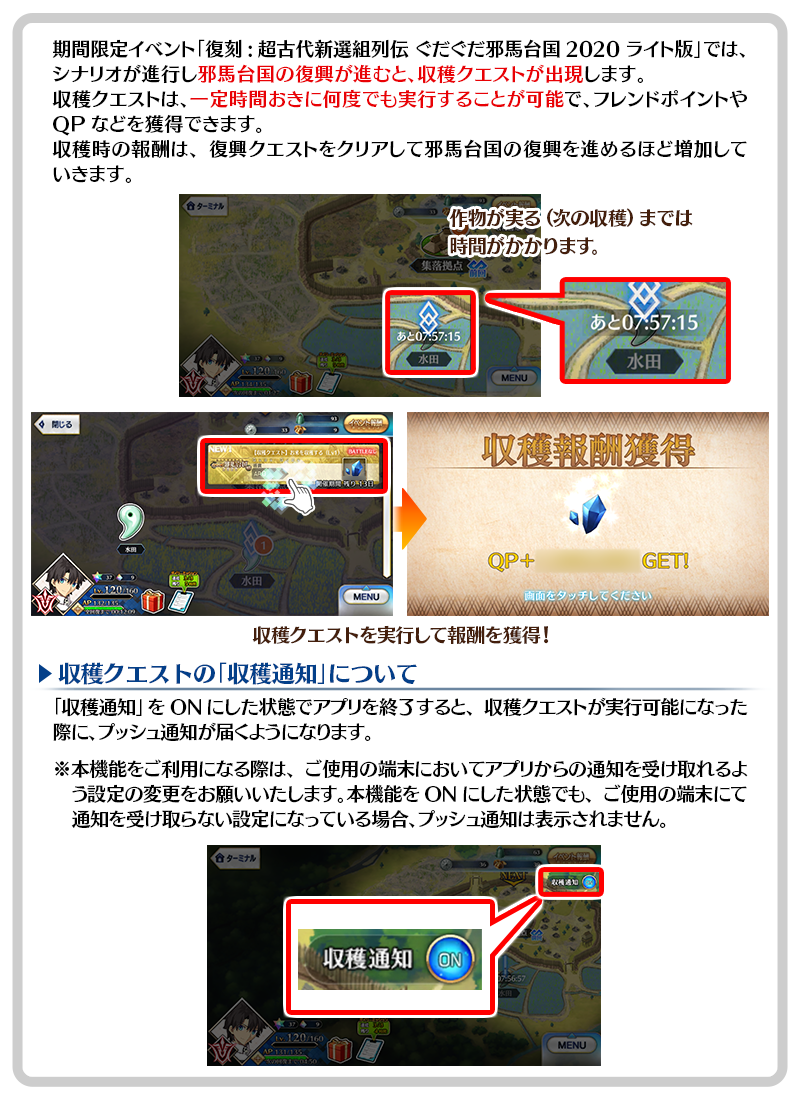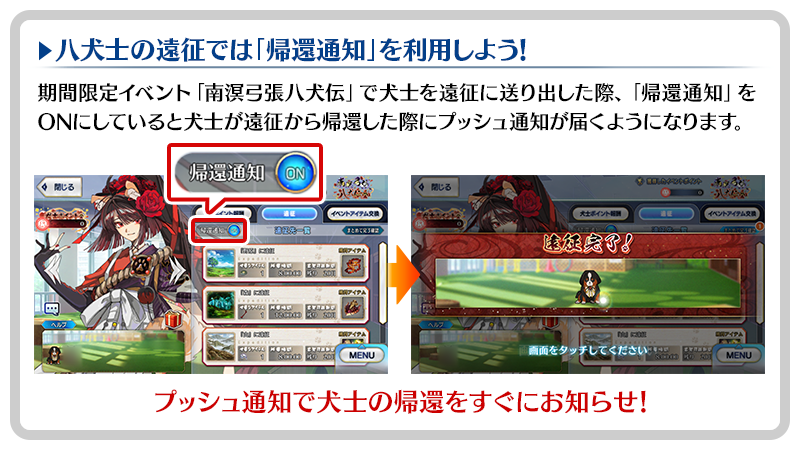 「全快通知」をONにしておくと、施設に設定したサーヴァント全員が全快した際にプッシュ通知が届くようになります。