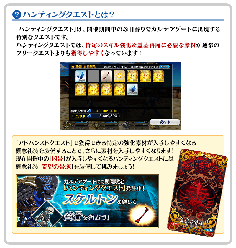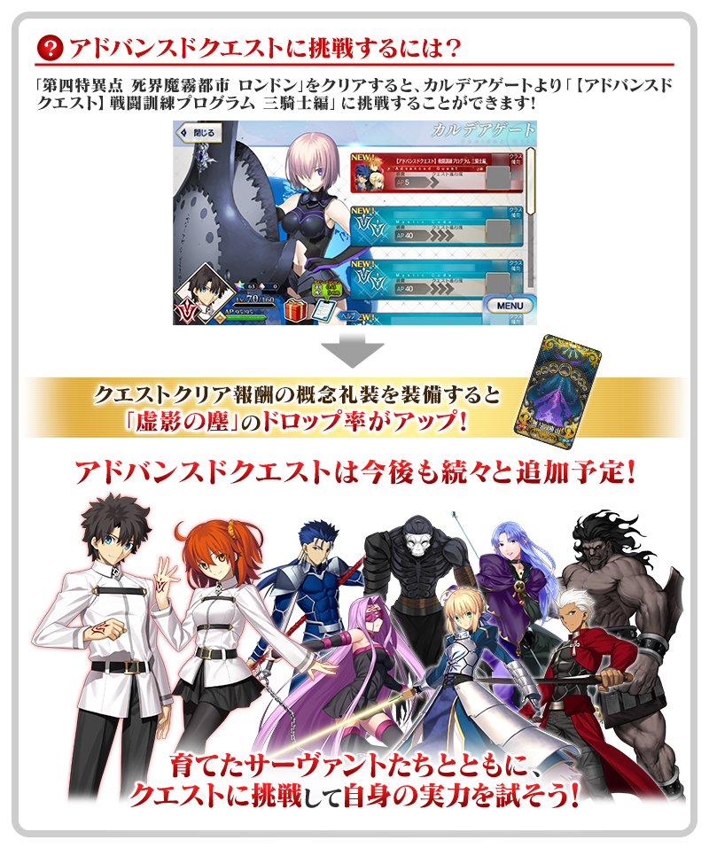 「アドバンスドクエスト」を初回クリアすると、特定の素材アイテムのドロップ率がアップする特別な概念礼装をゲットできます。