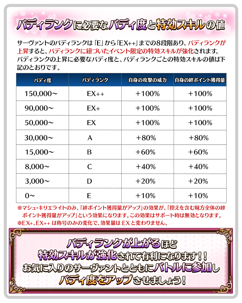 「クラススコア」は「サイン」を解放することで対応するクラスのすべてのサーヴァントにさまざまな強化効果を付与できるものです。