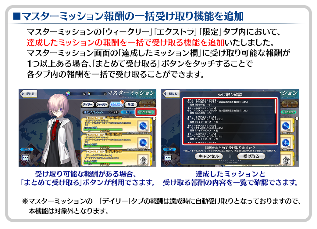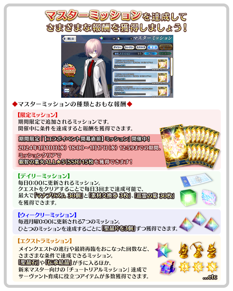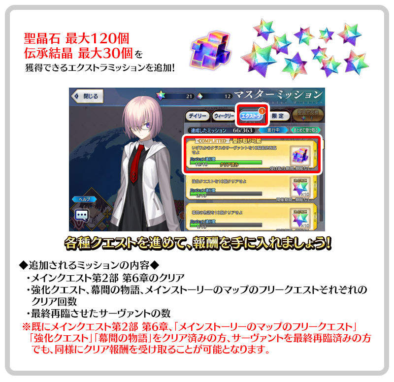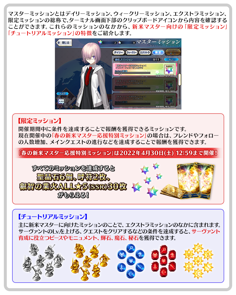 マスターミッションのエクストラ内にある「チュートリアルミッション」を達成することで、サーヴァント育成に役立つさまざまなアイテムを獲得できます。