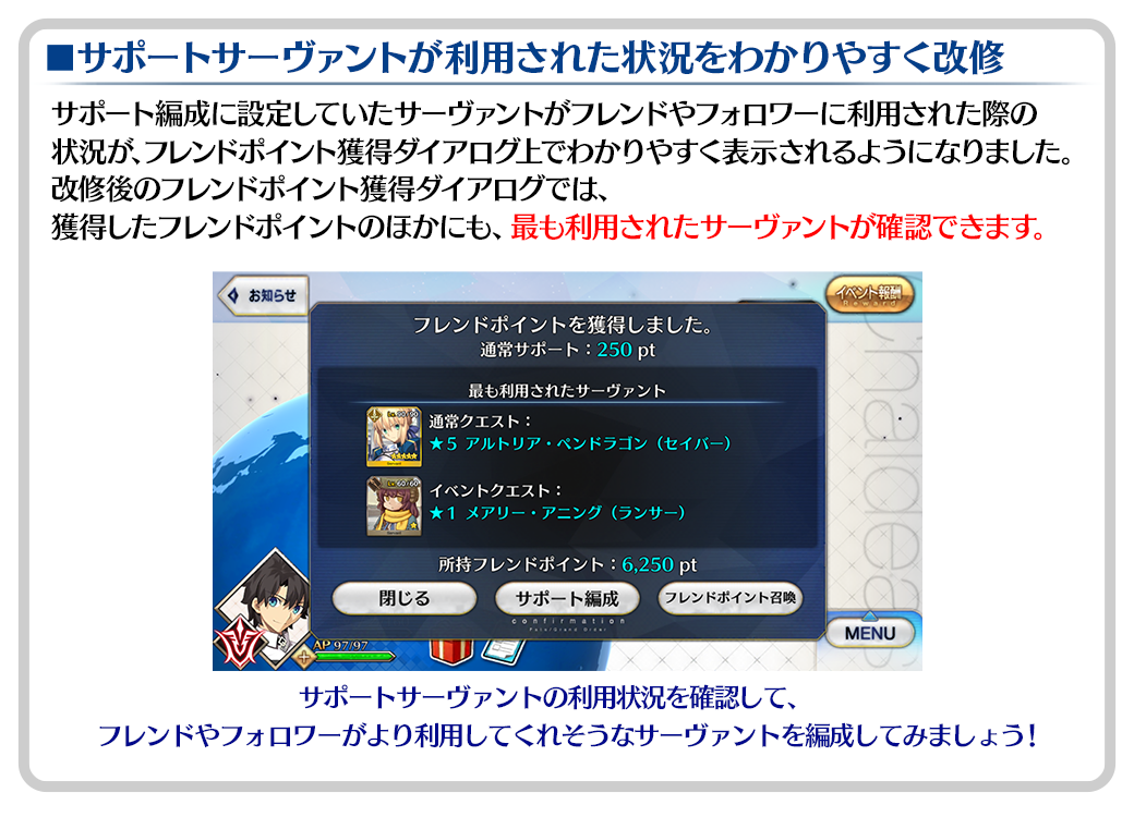なお、「オススメサポート編成」のサーヴァントは、自分が利用した際と他のマスターに利用してもらった際のどちらでも、フレンドポイントを獲得することができます。
