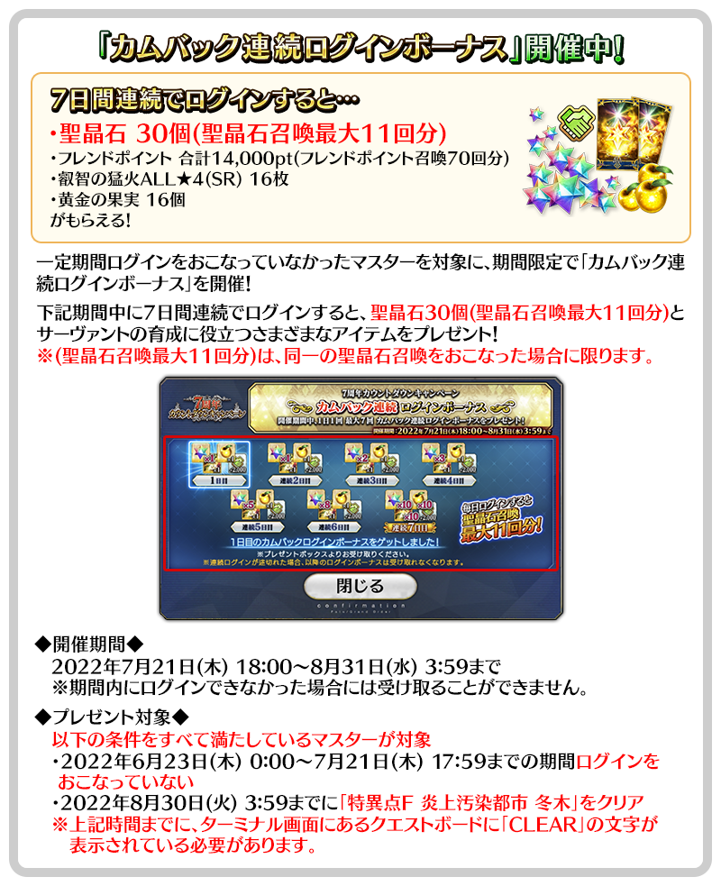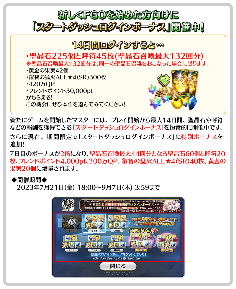 新たにゲームを開始したマスターは、プレイ開始から最大14日間、聖晶石や呼符などの報酬を獲得できる「スタートダッシュログインボーナス」を獲得できます。