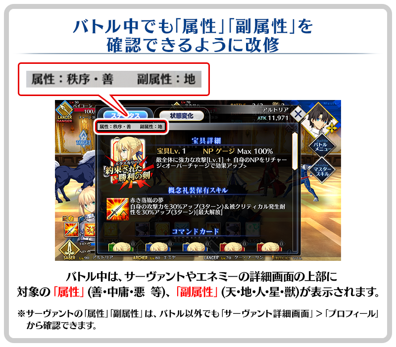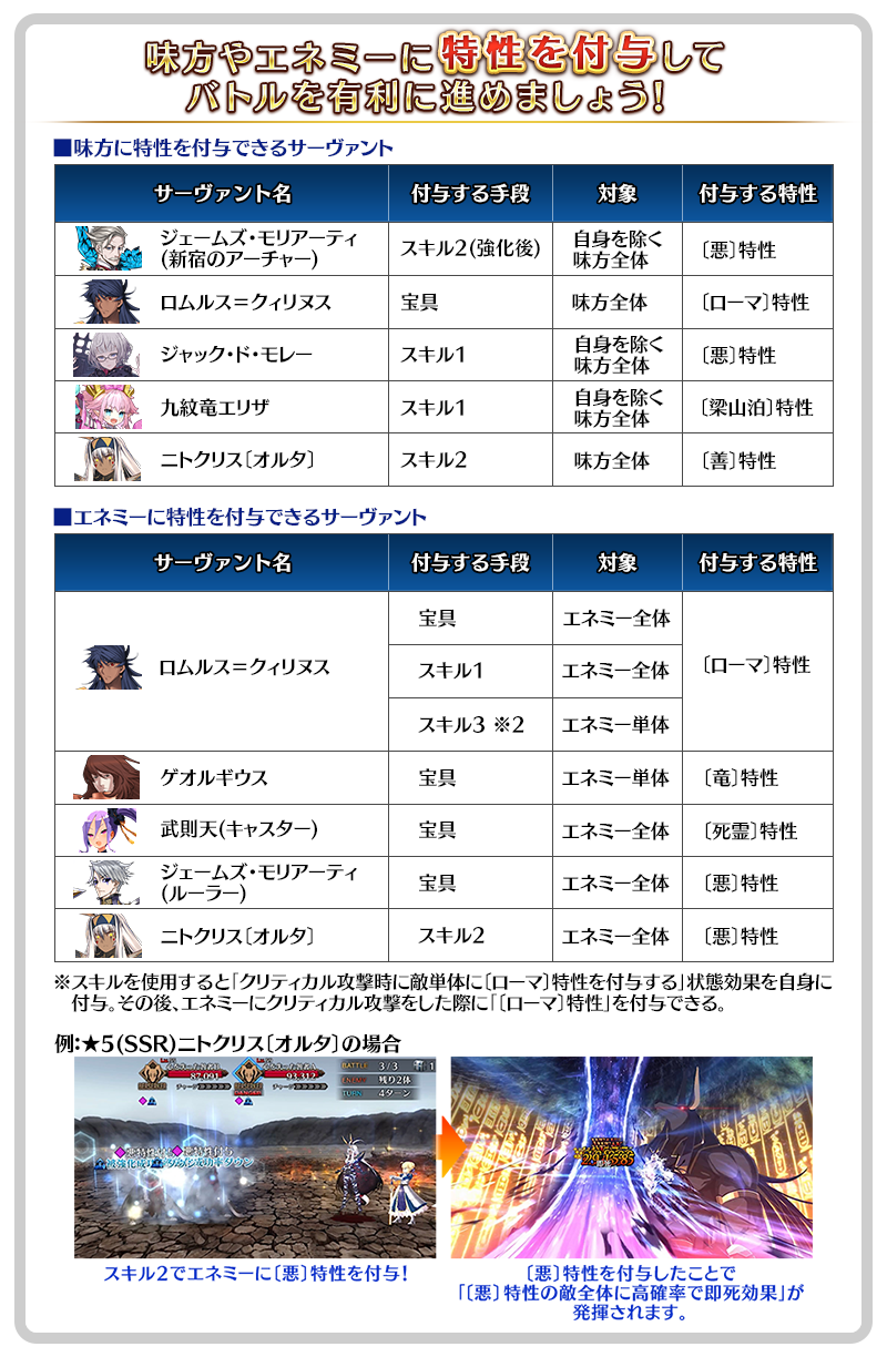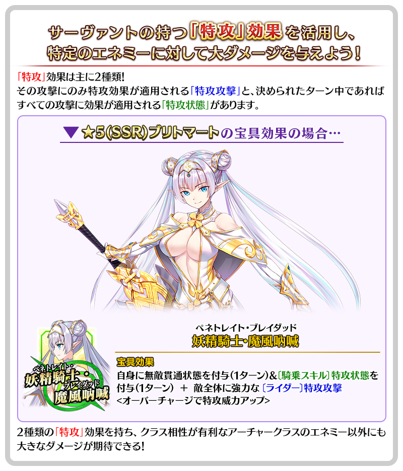 サーヴァントが持つ宝具やスキルの中には、特定のクラスや性別・属性などを持つ相手に対して、より大きなダメージを与える効果を発揮するものがあります。